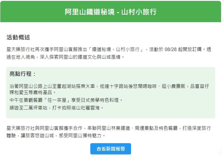 🌟 秋冬旅遊好去處!阿里山賓館 x 星天樂旅行社推出「鐵道秘境,山村小旅行」套裝行程