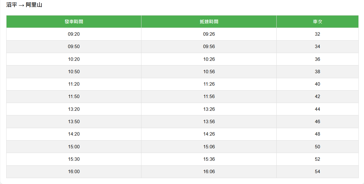 行駛區間:阿里山站 ↔ 沼平站