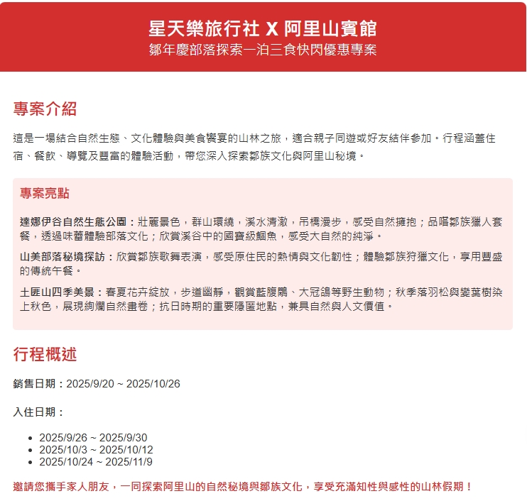 ✨嘉義星天樂旅行社與阿里山賓館攜手推出超值一泊三食快閃專案! 想體驗絕美山林?專案網羅自然生態之奧秘、原民智慧與美味料理,帶您穿梭風景如詩的達娜伊谷,深入沾滿歲月痕跡的山美部落秘境,更提供機會賞析鄒族族人精湛傳統歌舞表演、大啖珍饌——不容錯過的獵人套餐!旅行期間,不妨徒步探索土匪山,將那四季變幻的絕倫景觀盡收眼底。 📌 媒體介紹: 【愛遊網】【產經新聞網】【聯合新聞網】【經濟日報】【我傳媒】👉訂購連結:阿里山賓館,星天樂旅行社預約屬於您的身心探索之旅,體驗山川美妙、文化深度!無論是忘卻煩憂與靜享大地,還是挖掘原居地緣秘密,這都是一次無需安排的完美高感休假!✨