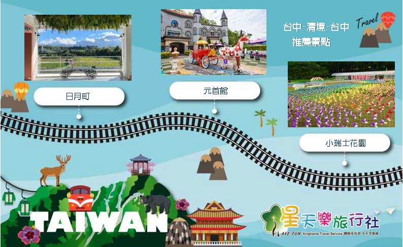 台中(出發)→日月町→清境農場→小瑞士花園→元首館→台中(回程)