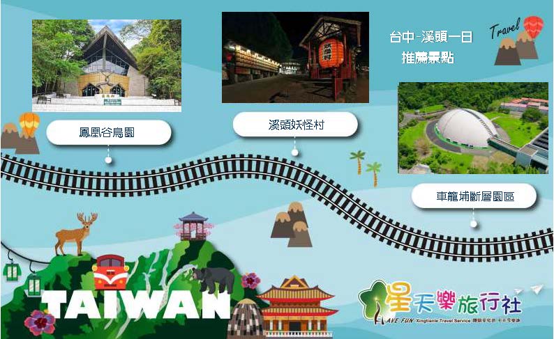 台中(出發)→車籠埔斷層園區→鳳凰谷鳥園→溪頭自然教育園區→溪頭妖怪村(回程)