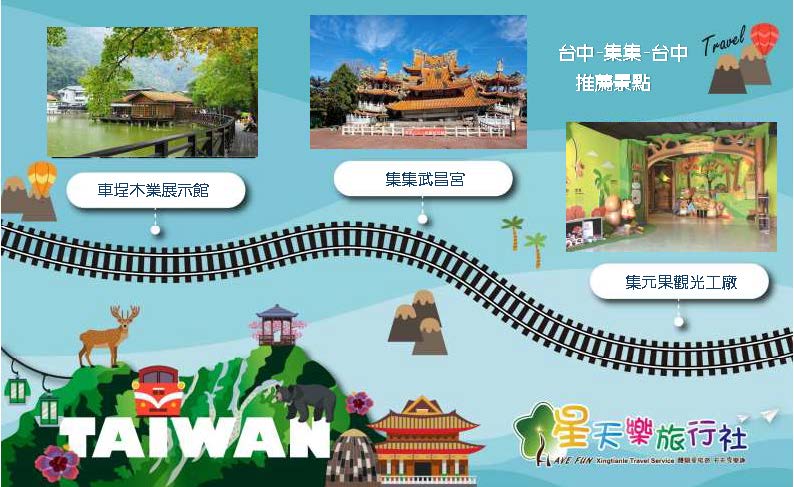 台中(出發)→集集小鎮→集集武昌宮→集元果觀光工廠→車埕木業展示館→台中(回程)