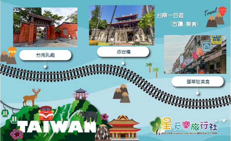 台南(出發)→赤崁樓→台南孔廟→國華街美食→安平古堡→台南或是嘉義(回程)