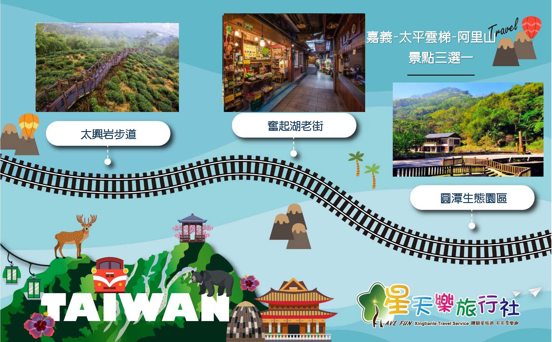 嘉義(出發)→太平雲梯→(太興岩步道→圓潭生態園區→奮起湖,景點三選一)→阿里山(回程)