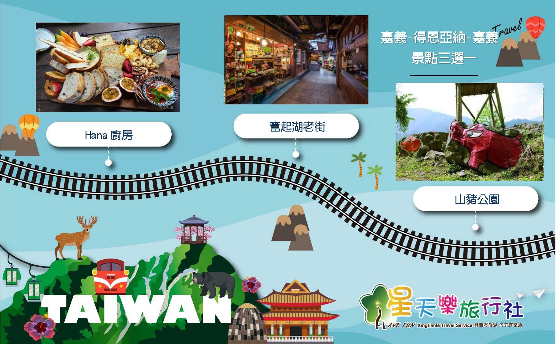 嘉義(出發)→得恩亞納→(Hana廚房→奮起湖老街→山豬公園,景點三選一)→阿里山(回程)