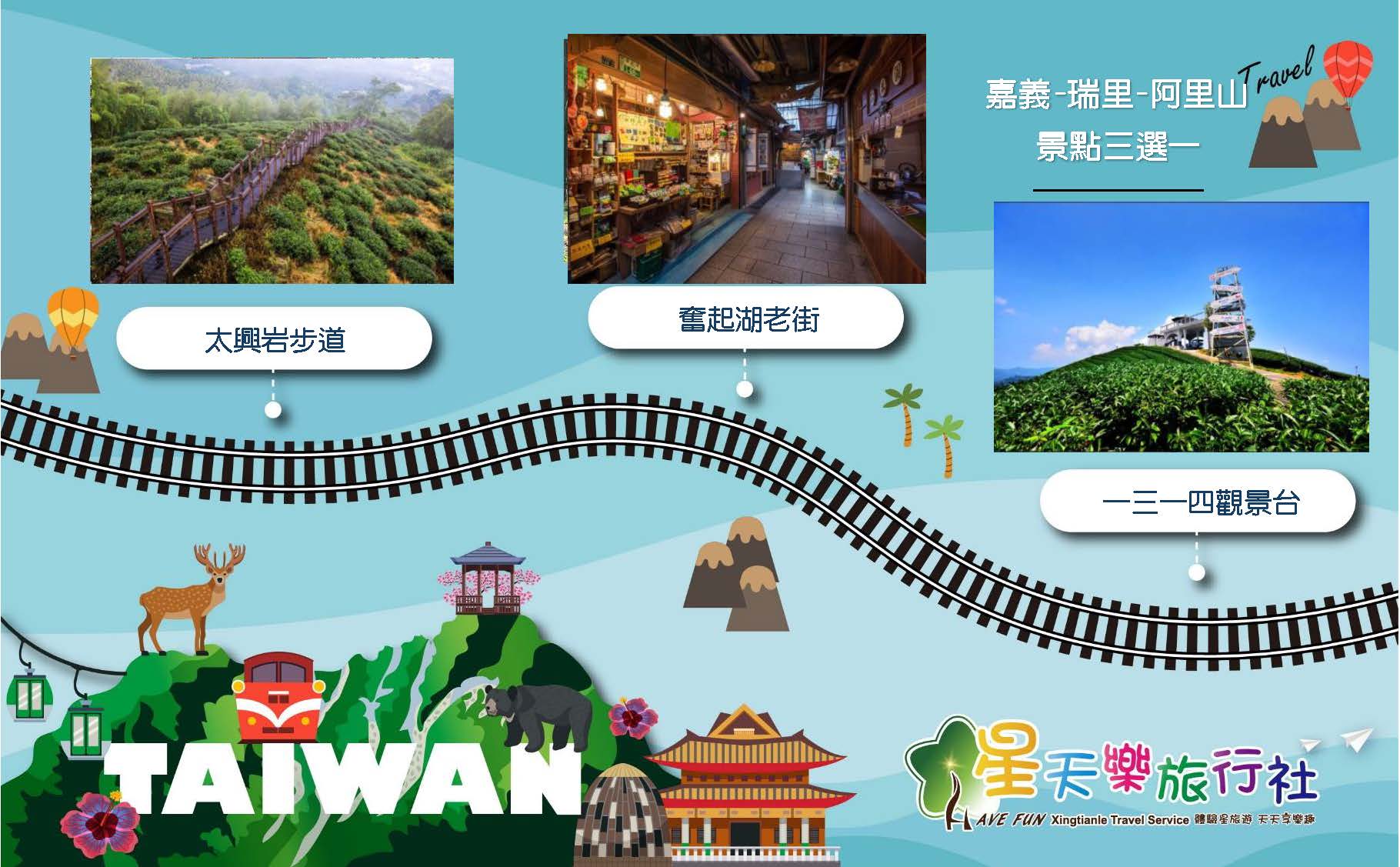 嘉義(出發)→圓潭生態園區→(太興岩步道→一三一四觀景台→奮起湖,景點三選一)→阿里山(回程)