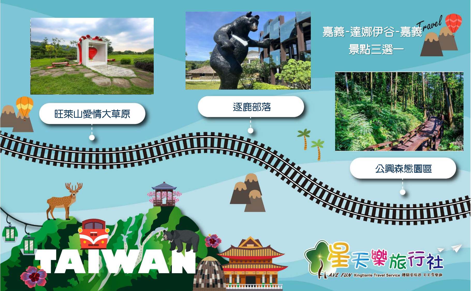 嘉義(出發)→達娜伊谷→(公興森態園區(土匪村)→旺萊山愛情大草原→鄒族逐鹿文創園區,景點三選一)→阿里山(回程)