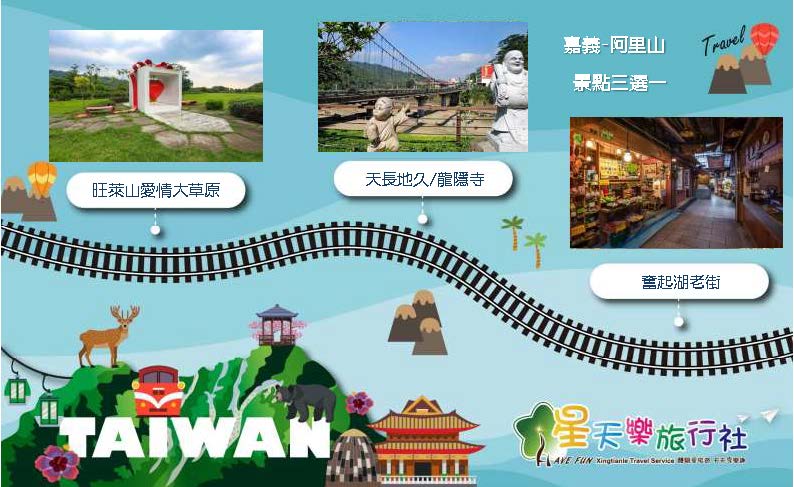 嘉義(出發)→(天長地久/龍隱寺→奮起湖老街→旺萊山愛情大草原,景點三選一,停留一小時)→阿里山(回程)