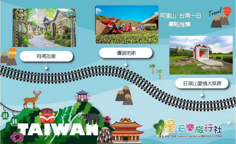 阿里山(出發)→優遊吧斯→阿將的家→旺萊山愛情大草原→台南(回程)